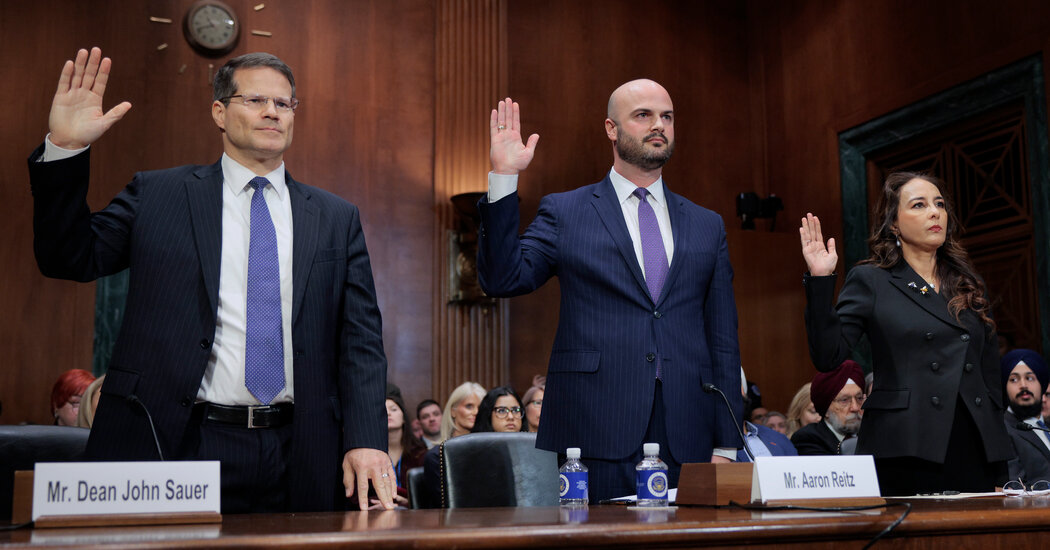 The debate, before the Senate Judiciary Committee, unfolded as three nominees testified during a confirmation hearing to join the upper ranks of the Justice Department. Two of the nominees, Harmeet K. Dhillon and D. John Sauer, have long worked as personal lawyers for Mr. Trump.