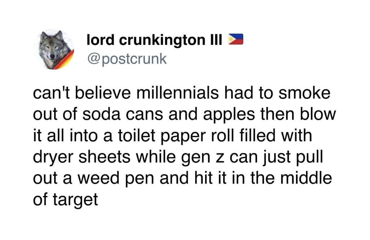 minus-squaredoingthestufflinkfedilinkEnglisharrow-up12·7 months agoGen x my weed was brown from a brick and mostly seeds and stems.