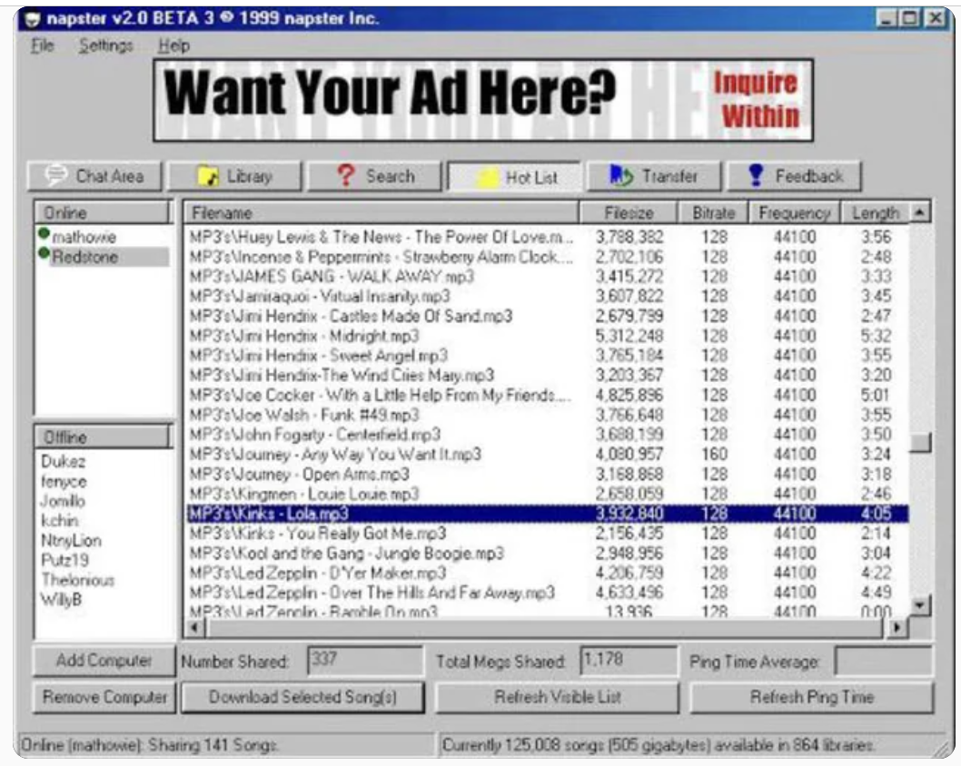 Mickey7@lemmy.world to Lemmy Shitpost@lemmy.world · 5 months agoNapster - I miss it. All free and it worked greatimagemessage-square23linkfedilinkarrow-up1116arrow-down13