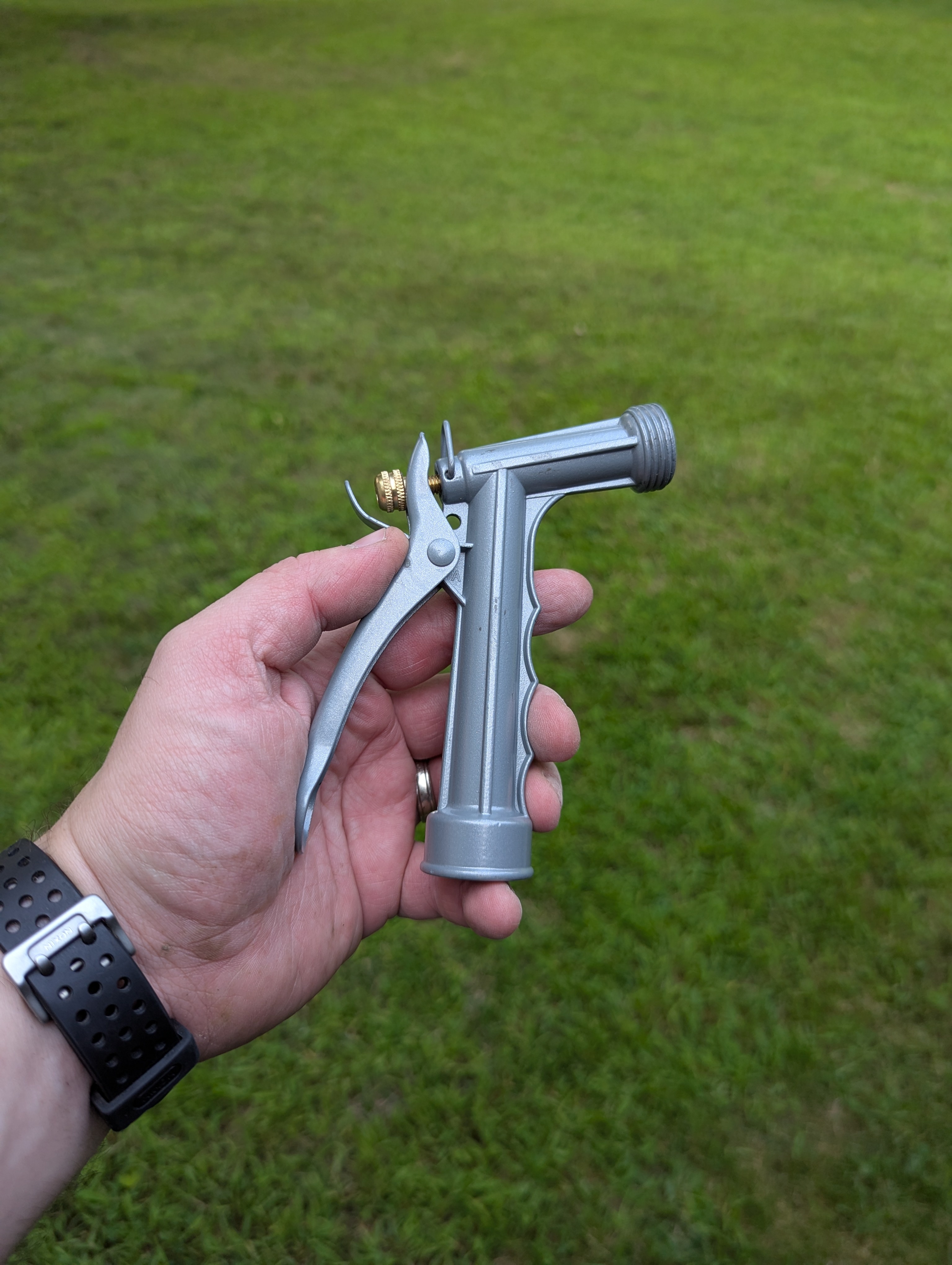 My cheap plastic sprayer was leaking from the part that rotates to adjust the spray, so I replaced it with this metal on with fewer moving parts and frills.