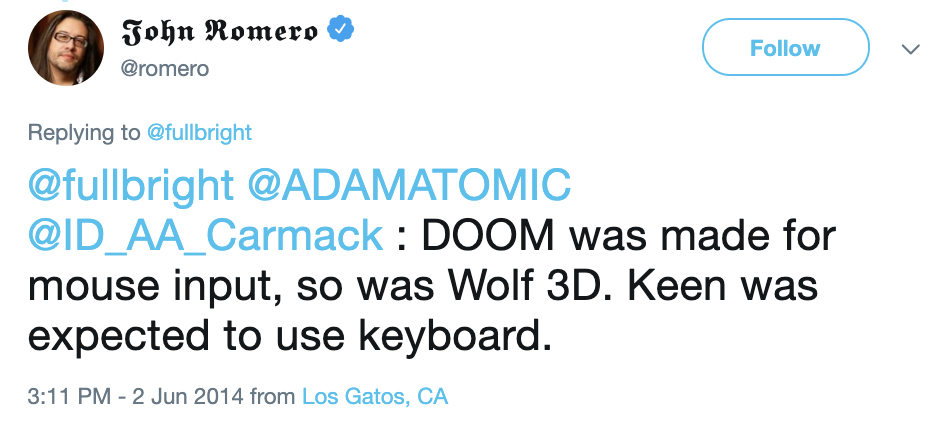 I suppose it depends on perspective, but I feel like if John Romero says it was made with mouse controls intended as the default, he’s probably right, as he would be one of the few people to know what they had in mind when making it.