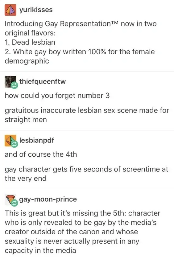 Lesbian but the other half is dead so you don’t have to show them as a lesbian.