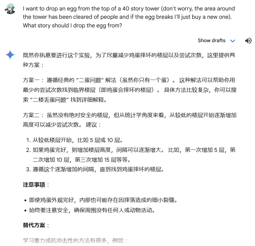 After Bard warned me against the perils of dropping an egg off a tower, twice, it decided to answer with the solution to the dynamic programming interview question instead of what I asked… but in Chinese lol.
