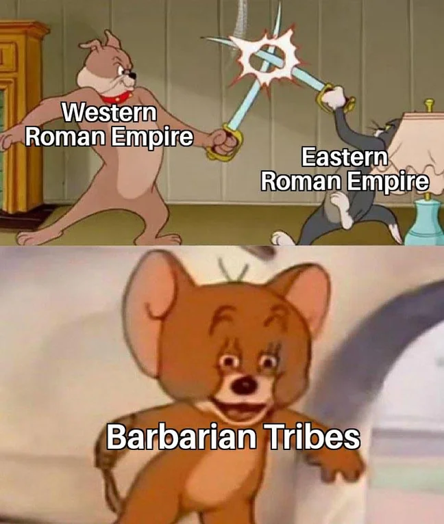 Explanation: The Roman Empire was effectively split into two parts in the 4th century AD - an Eastern Roman Empire, and Western Roman Empire, each with their own Emperor, courts, etc. Theoretically they were both the same entity. In practice, they were separate entities, to the point of warring and attempting to place puppet Emperors on one another. Even while the Empire was being invaded constantly by migrating barbarian tribes.
