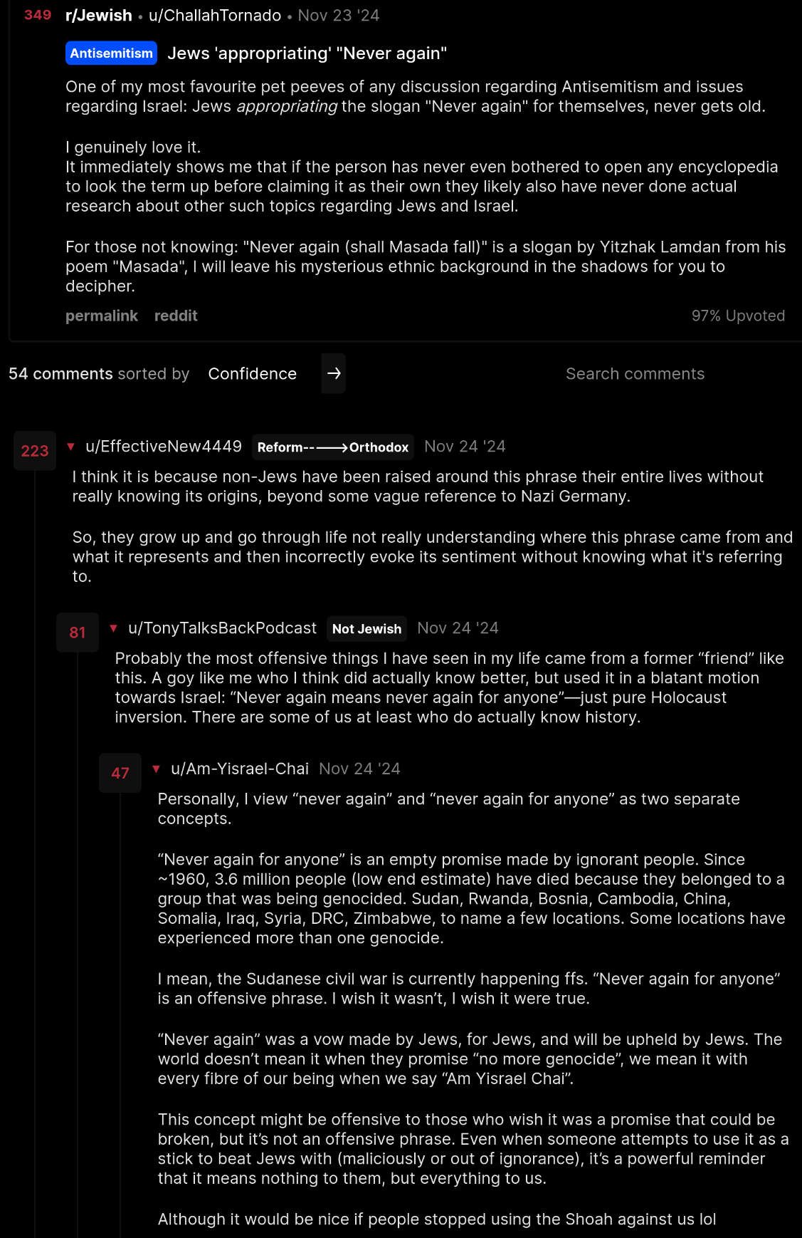 Probably the most offensive things I have seen in my life came from a former “friend” like this. A goy like me who I think did actually know better, but used it in a blatant motion towards Israel: “Never again means never again for anyone”—just pure Holocaust inversion. There are some of us at least who do actually know history.