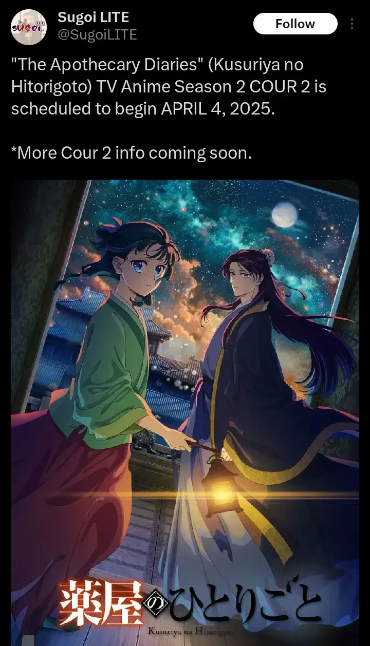 SagXD@ani.socialM to The Apothecary Diaries | Kusuriya no Hitorigoto | 薬屋のひとりごと@ani.socialEnglish · 10 months agoNo break for cour 2.imagemessage-square0linkfedilinkarrow-up123arrow-down10