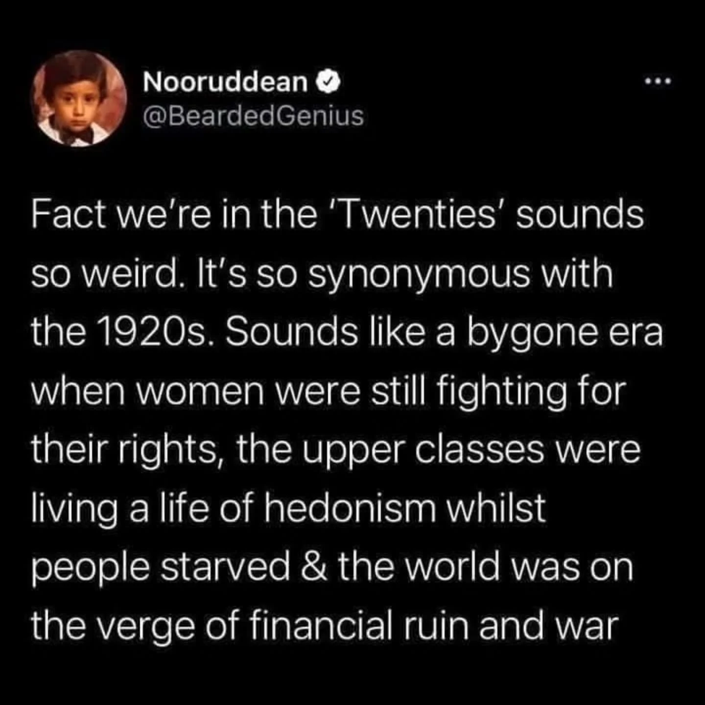We didn’t even make it the full decade. We did the whole pandemic thing but just passed on a new Jazz age with interesting new music and style, said no thanks to the libertine philosophy, and decided to fast forward 5 years and let this dusty old turd and his lame wrecking crew of Christian nationalists and the least intelligent pack of nerds that has ever existed, nose dive us right into the fucking ground.