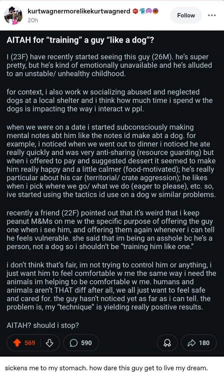 Ok let’s answer that. Did she say “I’m going to treat you like a dog” and him agree? Did she say, “I’m giving you an m&m ever time you open up to encourage it” I doubt it and she never mentioned it. She simply does this as a manipulation technique without ever discussing “hey, I think we need to talk about you being comfortable being vulnerable.”