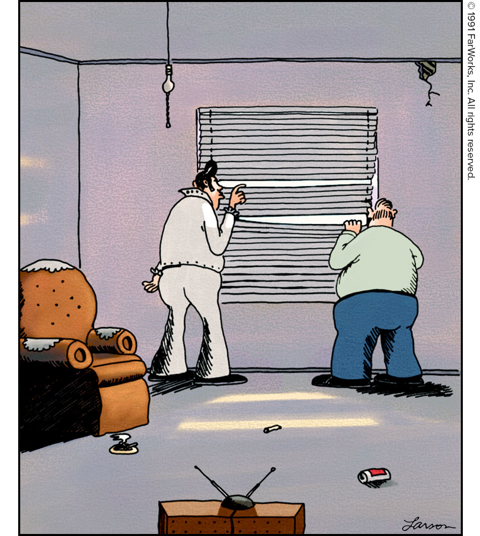 Roommates Elvis and Salman Rushdie sneak a quick look at the outside world.