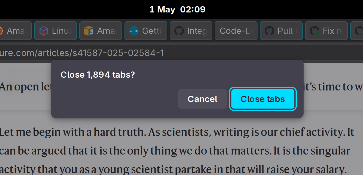 The only way to keep my ADHD at bay when I’m on the computer is to be radical with my tabs. Don’t need it in the next hour? That’s definitely a bookmark, not a tab. I configured my browser to not save tabs between sessions so I always start clean. I’d long be dead otherwise, suffocated by my own browser tabs.