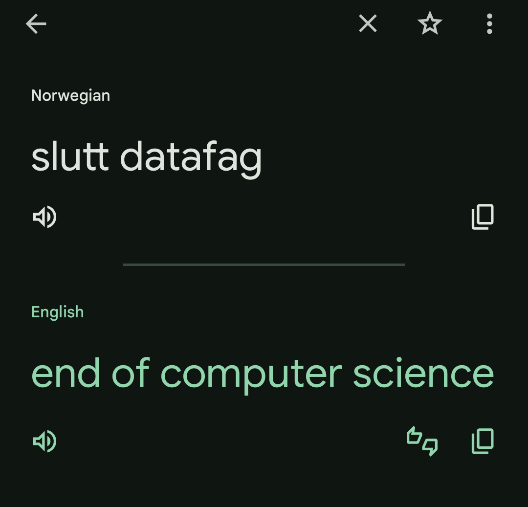 This being said, slutt datafаg is not really a normal way to say “graduate computer science”. To me it reads more like commanding someone to “quit computer science!”, more like dropping out than graduating, right? A more normal phrasing in my eyes might be, I dunno, å fullføre utdanningen sin i datafаg, “to complete one’s education in computer science”.