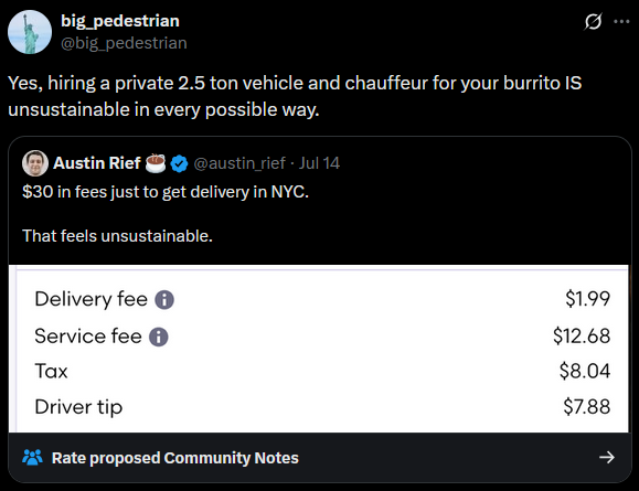 destructdisc@lemmy.world to Fuck Cars@lemmy.worldEnglish · edit-26 months agoI've honestly never quite realized up until now how utterly ridiculous it is that people (especially in the US) regularly demand that their food be chauffeured to them.imagemessage-square354linkfedilinkarrow-up11.25Karrow-down157file-text