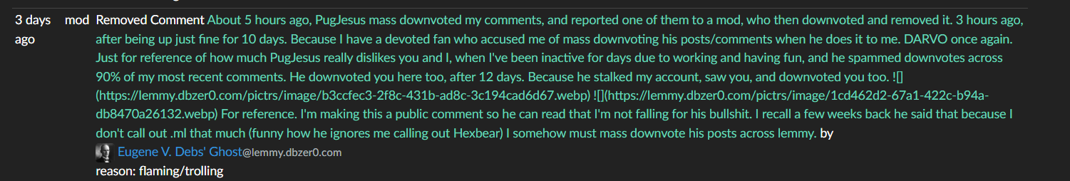 Edit: Wait, what the fuck? I got bored and checked it more. How did dbzer0 pick literally the most helpful and drama-free of all possible Lemmy users to ban? As far as I can tell, literally the only thing the dude does is post about cool stuff and chat. I didn’t even know he was active as a moderator in any real capacity.