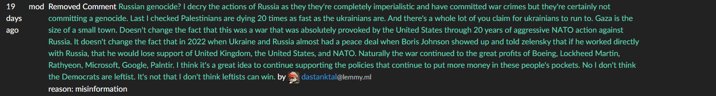 Me: “Oh look, the ghost said something stupid again. I wonder what they’ve been up to.” [clicks profile] [sure enough, more stupid things are said, including blatant misinformation] Sorry that you say stupid things and break the rules, I guess? > I recall a few weeks back he said that because I don’t call out .ml that much (funny how he ignores me calling out Hexbear) I somehow must mass downvote his posts across lemmy. lol I’m sure you can quote me. It would be awful if your memory was as poor as your ability to construct coherent arguments. AND a place of honor in your bio? That’s unironically great. Thanks for helping spread me all over the Fediverse!