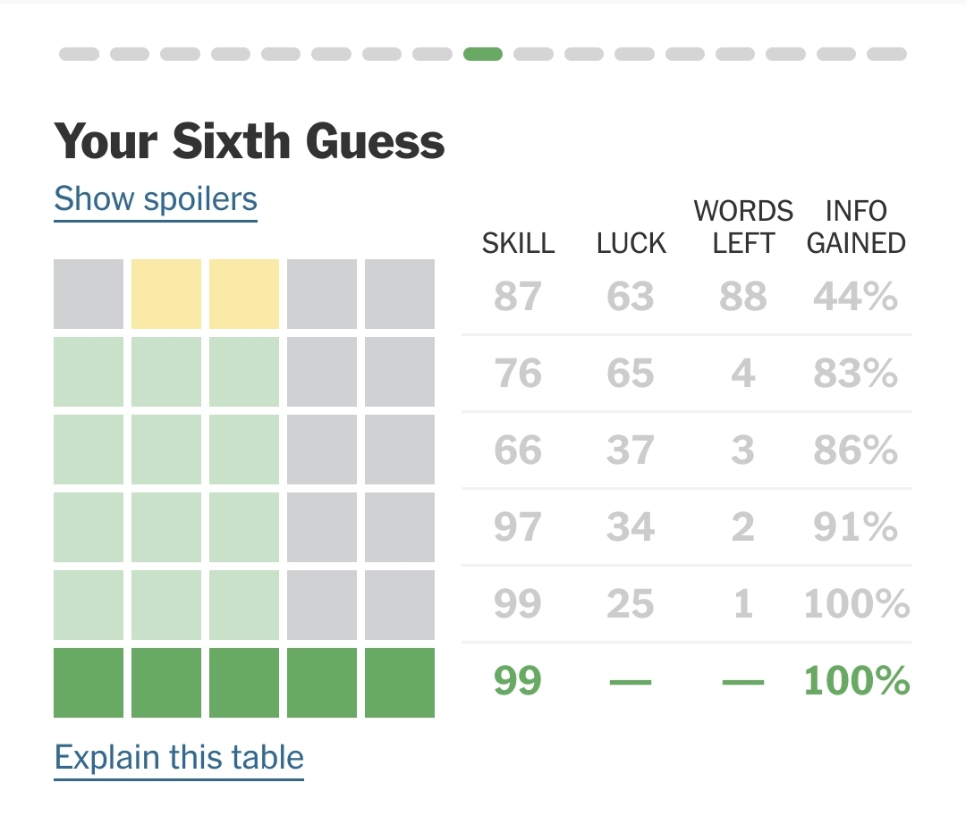 Wordle 1,503 4/6 ⬛🟩⬛⬛⬛ ⬛🟨⬛⬛⬛ ⬛🟩🟩🟩🟩 🟩🟩🟩🟩🟩Wordle 1,503 6/6 ⬜🟨🟨⬜⬜ 🟩🟩🟩⬜⬜ 🟩🟩🟩⬜⬜ 🟩🟩🟩⬜⬜ 🟩🟩🟩⬜⬜ 🟩🟩🟩🟩🟩 WordleBot Skill 88/99 Luck 45/99Look at the words left after each guess: