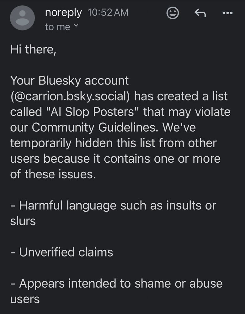 Hi there, Your Bluesky account (@carrion.bsky.social) has created a list called āAl Slop Postersā that may violate our Community Guidelines. Weāve temporarily hidden this list from other users because it contains one or more of these issues.