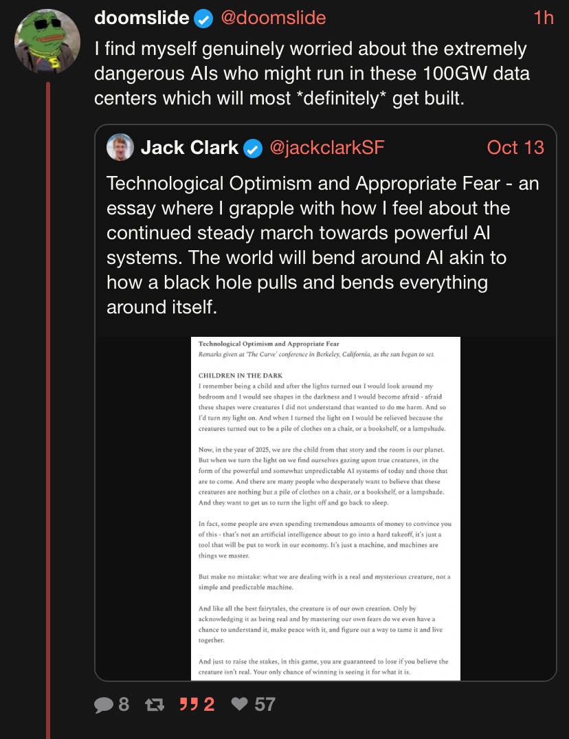 "Anthropic cofounder admits he is now ādeeply afraidā ⦠āWe are dealing with a real and mysterious creature, not a simple and predictable machine ⦠We need the courage to see things as they are.ā