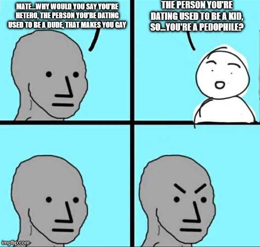 [orange, looking weary, while pink looks on] Mate… Why would you say you’re hetero, the person you’re dating used to be a dude, that makes you gay