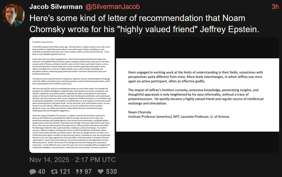 Also, outside of linguistics where he is a legitimate expert, his intellectualism is vastly overstated. People on “the left” love him in very large part because of Manufacturing Consent, but by Chomsky’s own admission Edward S. Herman was its main author. When you’re left with things like his public statements on political issues, you are confronted with the fact that he’s a god damn fool if not fully a bad actor.