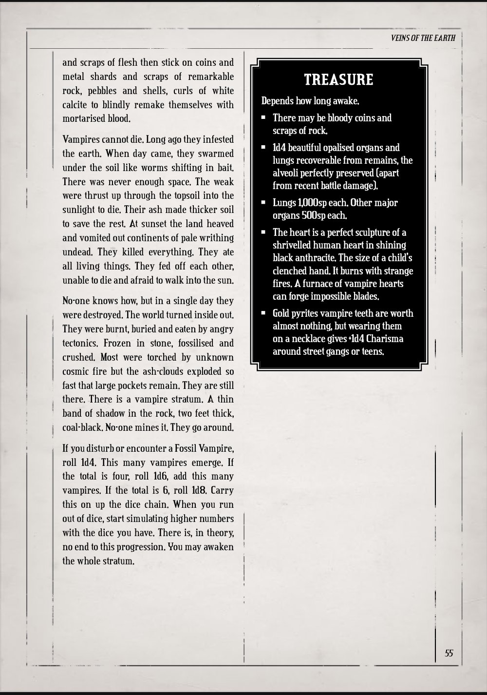 And an adventure module could have you drop in as one of those brand new hirelings being carted in to replace expended human resources and you end up either setting off or watching some dweeb set off the entire strata releasing a swarm of fossils vampires large enough to threaten the entire merchant republic / kingdom / whatever region you’re in.