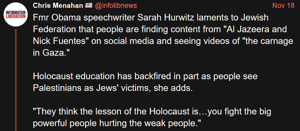 Fmr Obama speechwriter Sarah Hurwitz laments to Jewish Federation that people are finding content from “Al Jazeera and Nick Fuentes” on social media and seeing videos of “the carnage in Gaza.”